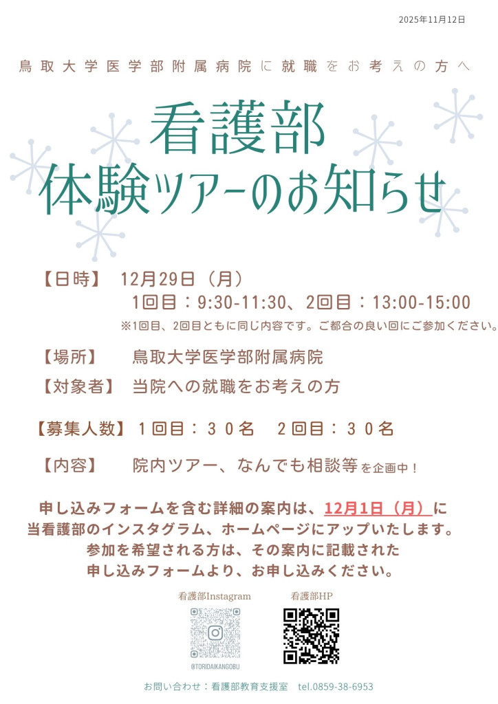 2025.11.12 看護部体験ツアー開催のお知らせ 看護部体験ツアーを企画いたしました! 12月1日(月)に、 申し込みフォームを含む詳細の案内をこちらのページにアップいたします。 皆様のご参加をお待ちしております⛄❄